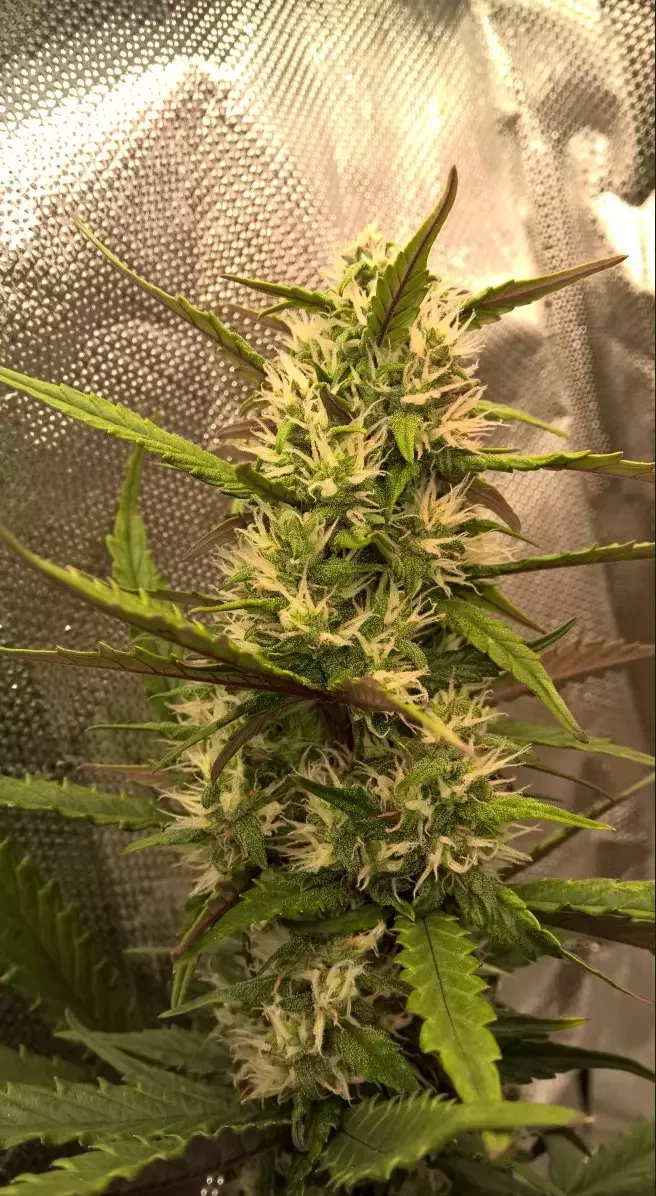 Update Tag 32. Die Sorte an sich ist gut. Beim ersten Mal habe ich nur einen Samen gekauft und der war der Hammer. Deshalb habe ich mir gleich ein Dreierpack geholt… und jetzt verstehe ich, warum sich alle beschweren. Von den dreien ist nur einer richtig gut geworden, und zwar der grüne Phänotyp. Der violette sah cool aus, hat sich aber ab Tag 18 komisch verhalten. Verdrehte Blätter, Flecken, die zu Löchern wurden, und dann hat er seine großen Fächer verloren. Der andere Samen im selben Topf und mit der gleichen Pflege war dagegen völlig in Ordnung. Ich habe endlich herausgefunden, wie ich mit ihnen umgehen muss, und jetzt wachsen sie ganz gut. Da sie aber schon an Tag 16 in die Vorblütephase eingetreten sind, hatten sie einfach keine Zeit, richtig an Masse zuzulegen. An Tag 20 waren sie schon voller Blütenstempel. Der letzte Samen ist gekeimt, sieht aber… verflucht aus. Verdrehte Blätter, gelbe Streifen, kein Wachstum in der Mitte. Und dazu noch ein winziger Samen. Also ja… schnell wachsend, blüht super früh, riecht angenehm, gutes High. Aber die Genetik im Dreierpack war irgendwie fragwürdig… reines Glückssache. Für Anfänger nicht empfehlenswert.